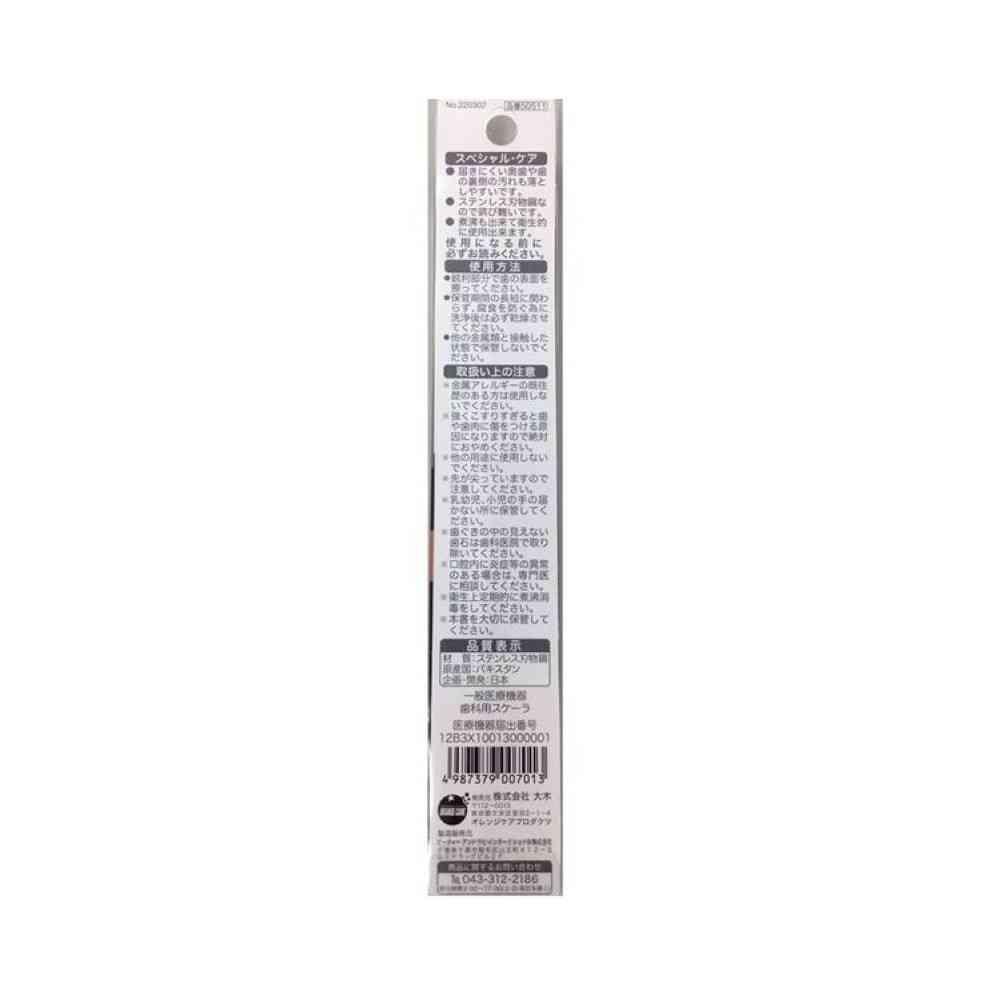 金属アレルギーの既住歴のある方は使用しないでください。 強くこすりすぎると歯や歯肉に傷をつける原因になりますので絶対におやめください。 他の用途に使用しないでください。 先が尖っていますので注意してください。 乳幼児、小児の手の届かない所に保管してください。 歯ぐきの中の見えない歯石は歯科医院で取り除いてください。 口腔内に炎症等の異常のある場合は、専門医に相談してください。 衛生上定期的に煮沸消毒をしてください。
