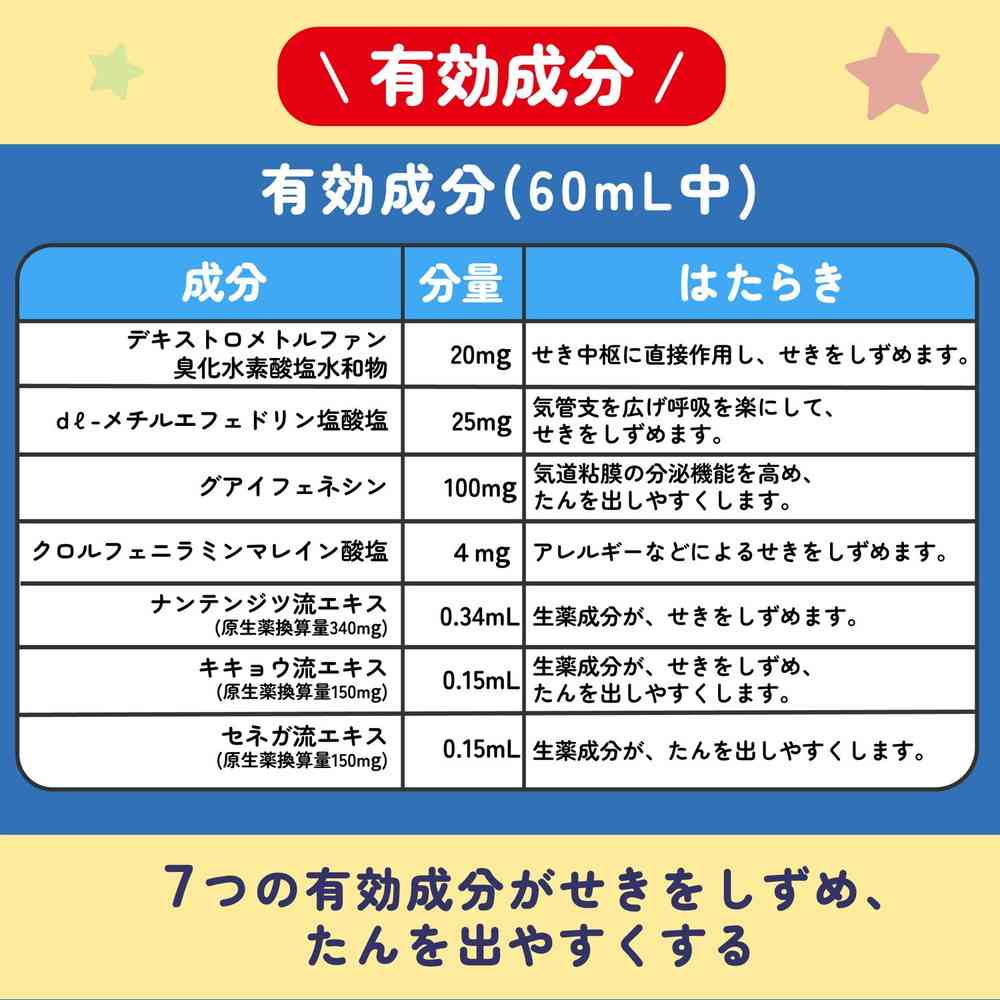 キキョウ流エキス(原生薬換算量150mg):0.15mL:生薬成分が、せきをしずめ、たんを出しやすくします。
