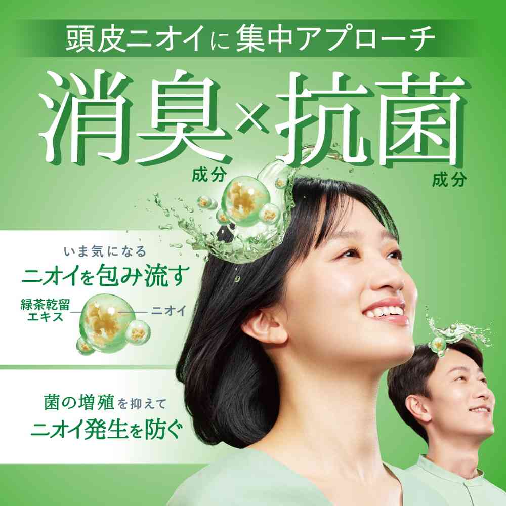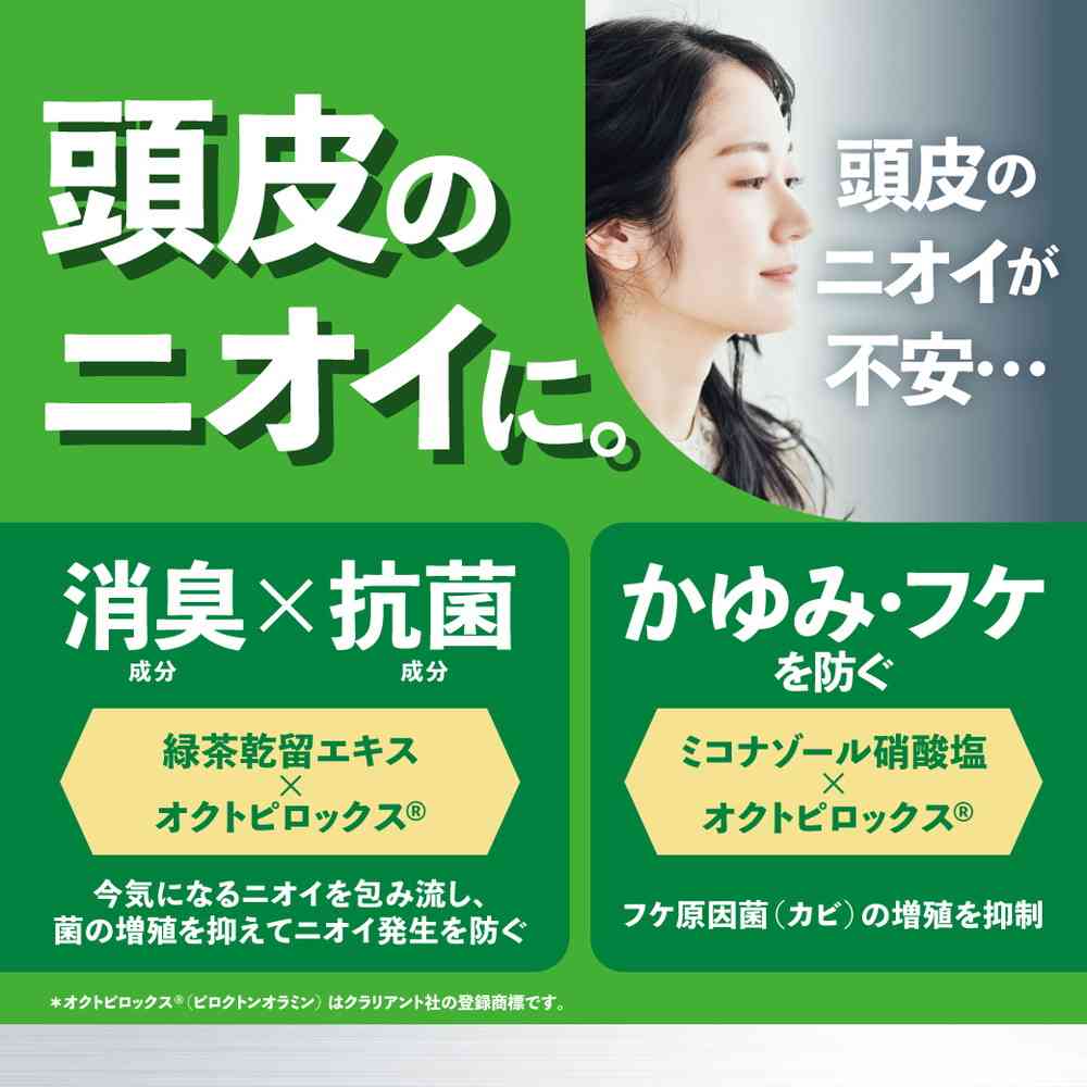 日本初、消臭・抗菌・抗真菌「有効成分トリプル処方」シャンプー。 消臭成分の緑茶乾留エキスが、今気になるニオイを吸着して流します。 抗酸化・抗菌成分のオクトピロックス(R)が皮脂の酸化を抑え、新たな頭皮のニオイの発生を防ぎます。 抗真菌(抗カビ)成分「ミコナゾール硝酸塩」と抗酸化・抗菌成分「オクトピロックス(R)」配合でフケ原因菌(カビ)の増殖を抑え、フケ・かゆみを防ぎます。さらに、フケ原因菌(カビ)の増殖を促進するオイル不使用。 コンディショニング成分配合で、髪がきしまず、なめらかな指どおり。 フルーティーフローラルの香り。 低刺激性。