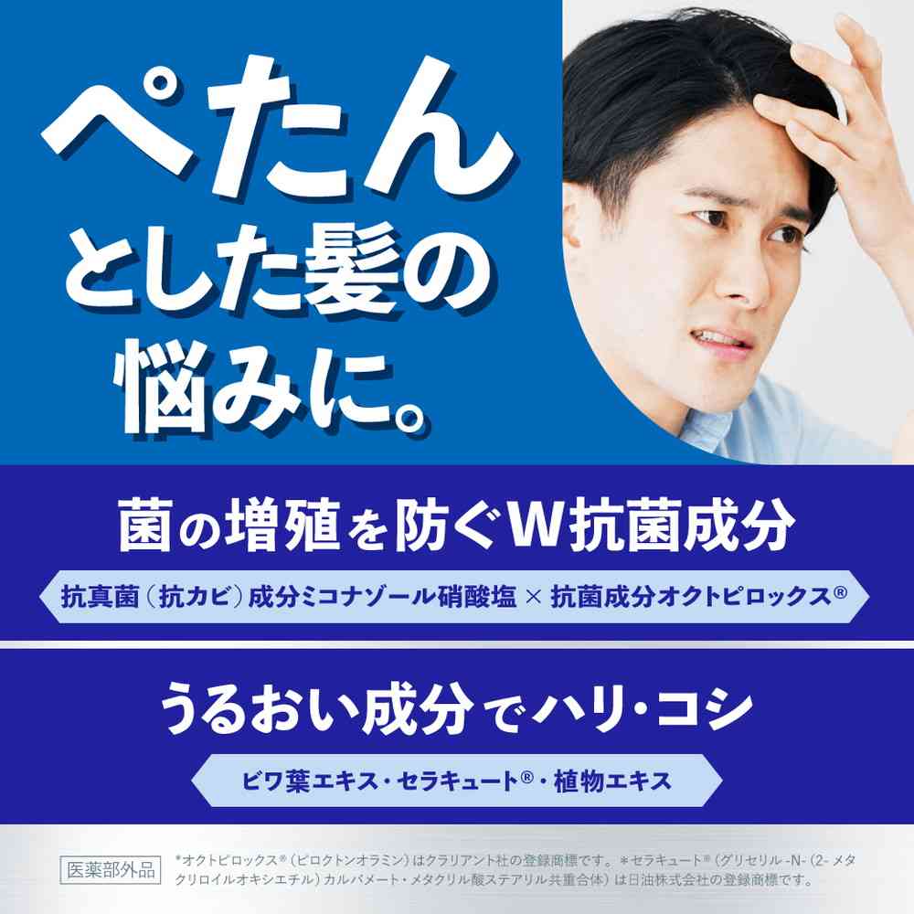 ベタつく頭皮を洗って汚れや菌を洗い流し、髪ボリューム感アップ! 健やかな頭皮を考え、10種の植物エキスに加え、抗真菌(抗カビ)成分「ミコナゾール硝酸塩」と抗酸化・抗菌成分「オクトピロックス(R)」配合でフケ原因菌(カビ)の増殖を抑え、フケ・かゆみを防ぎます。 さらに、フケ原因菌(カビ)の増殖を促進するオイル不使用。 うるおい成分のビワ葉エキスとセラキュートを配合。 メントール(清涼成分)配合で頭皮爽快! マリンシトラスの香り。 低刺激性。 コンディショニング成分配合で、髪きしまず、なめらかな指どおり。
