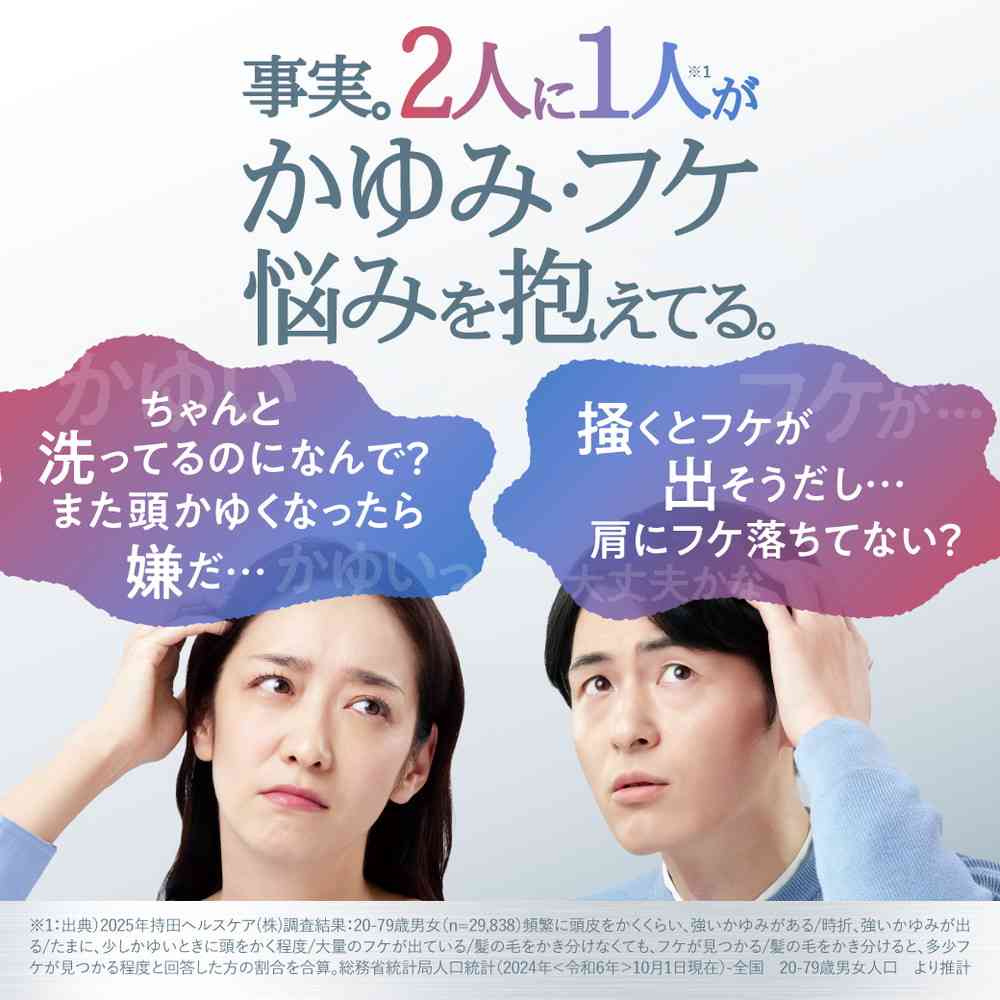 日本初!フケ・かゆみを防ぐ3つの有効成分を配合。 抗真菌(抗カビ)成分「ミコナゾール硝酸塩」と抗酸化・抗菌成分「オクトピロックス(R)」配合でフケ原因菌(カビ)の増殖を抑え、フケ・かゆみを防ぎます。 さらに、フケ原因菌(カビ)の増殖を促進するオイル不使用。 追加配合の抗肌荒れ成分グリチルリチン酸ジカリウムで、頭皮をすこやかに保ちます。 うるおい成分浸透型セラミド配合で、頭皮のバリア機能をサポート。 未来に向け頭皮環境を整え、頭皮をすこやかに保ちます。 低刺激性・無香料