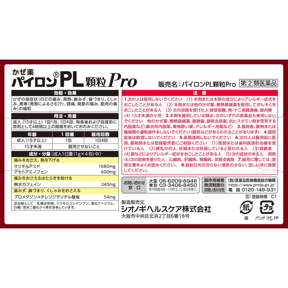 パイロンPL顆粒Proは、解熱鎮痛成分であるサリチルアミドとアセトアミノフェン、抗ヒスタミン成分であるプロメタジンメチレンジサリチル酸塩、痛みをおさえるはたらきを助ける無水カフェインの4つの有効成分の作用により、「のどの痛み」「発熱」「鼻みず」などのかぜの諸症状にすぐれた効果を発揮する非ピリン系のかぜ薬です。
