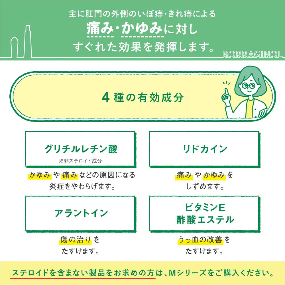 ●リドカインが痛み、かゆみをしずめます。グリチルレチン酸が炎症をやわらげ、痔の症状の緩和をたすけます。