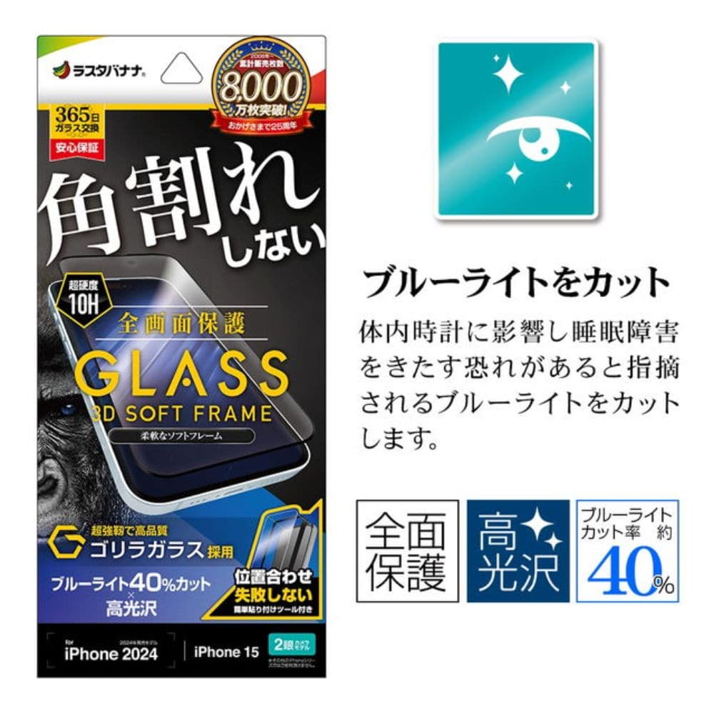 iPhone16、iPhone15、ガラスフィルム、ガラスフィルム、全面保護、ブルーライトカット、高光沢、角割れしない、ゴリラガラス採用、0.25mm、硬度10H、ソフトフレーム、簡単貼り付け、ブラック、アイフォン、保護フィルム、SGE4298IP461