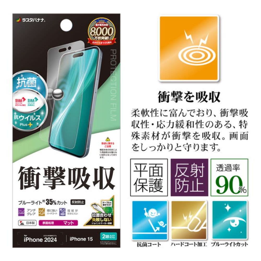 iPhone16、iPhone15、フィルム、フィルム、平面保護、衝撃吸収、ブルーライトカット、マット、アンチグレア、反射防止、抗菌、日本製、簡単貼り付け、アイフォン、保護フィルム、VY4375IP461