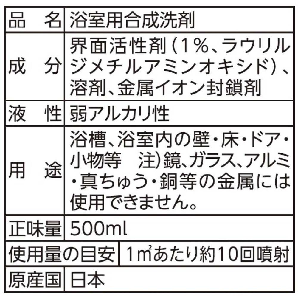 なかなか落ちない浴室の水アカや石けんカス、皮脂汚れなどのお風呂の汚れをスッキリ洗浄。 使えるところ:浴槽、浴室の壁、床・ドア、シャワーカーテン、風呂フタ、洗面器、イス等の小物。 使えないところ:鏡、ガラス、アルミサッシ、アルミ・真ちゅう・銅等の金属、木製品、大理石等の天然石、しっくい壁、照明器具本体 使用量:1平方メートルあたり約10回噴射