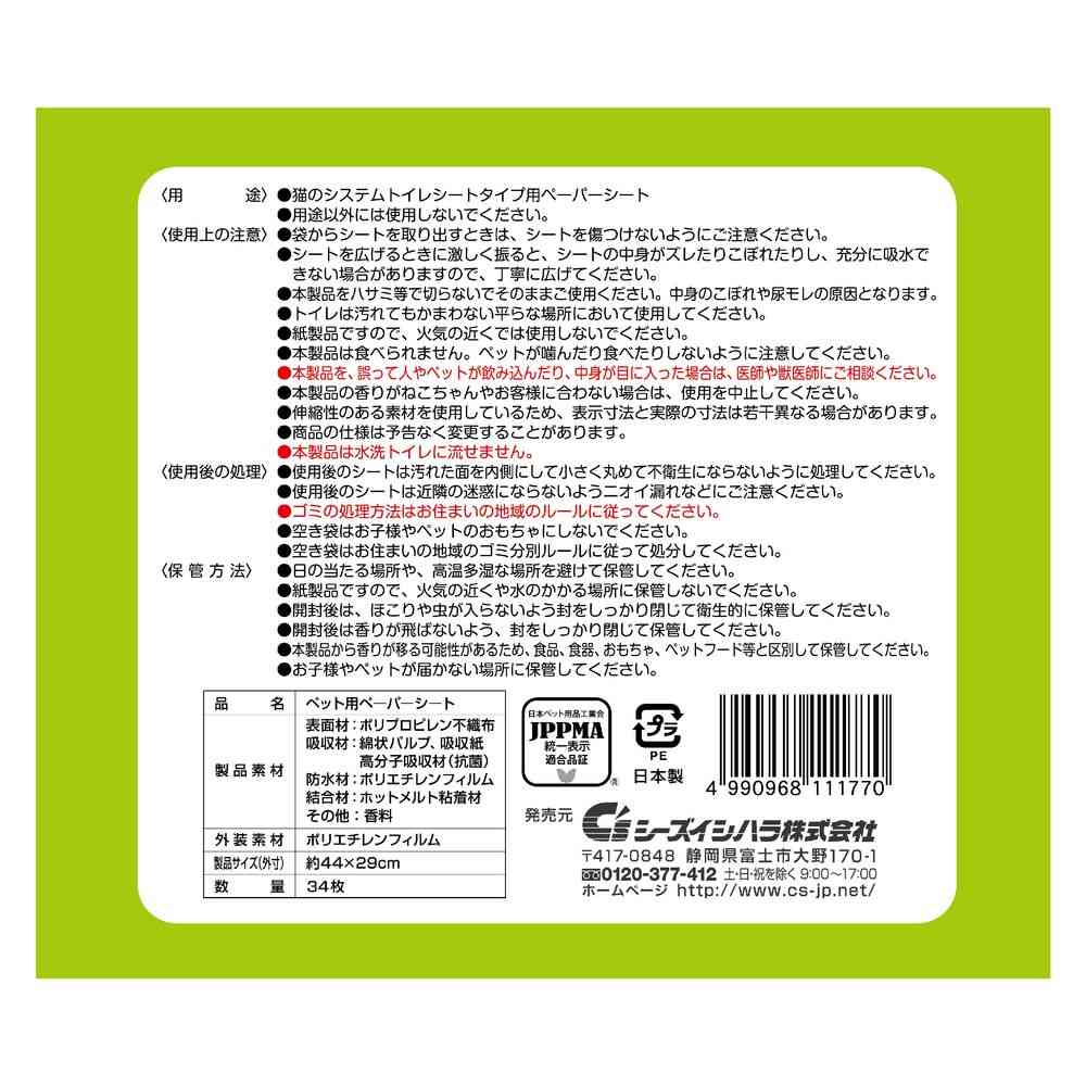 袋からシートを取り出すときは、シートを傷つけないようにご注意ください。 シートを広げるときに激しく振ると、シートの中身がズレたりこぼれたりし、充分に吸水できない場合がありますので、丁寧に広げてください。 本製品をハサミ等で切らないでそのままご使用ください。中身のこぼれや尿モレの原因となります。 トイレは汚れてもかまわない平らな場所において使用してください。 紙製品ですので、火気の近くでは使用しないでください。 本製品は食べられません。ペットが噛んだり食べたりしないよう注意してください。 本製品を、誤って人やペットが飲み込んだり、中身が目に入った場合は、医師や獣医師にご相談ください。 本製品の香りがねこちゃんやお客様に合わない場合は、使用を中止してください。 伸縮性のある素材を使用しているため、表示寸法と実際の寸法は若干異なる場合があります。 本製品の仕様は、予告なく変更することがあります。 本製品は水洗トイレに流せません。