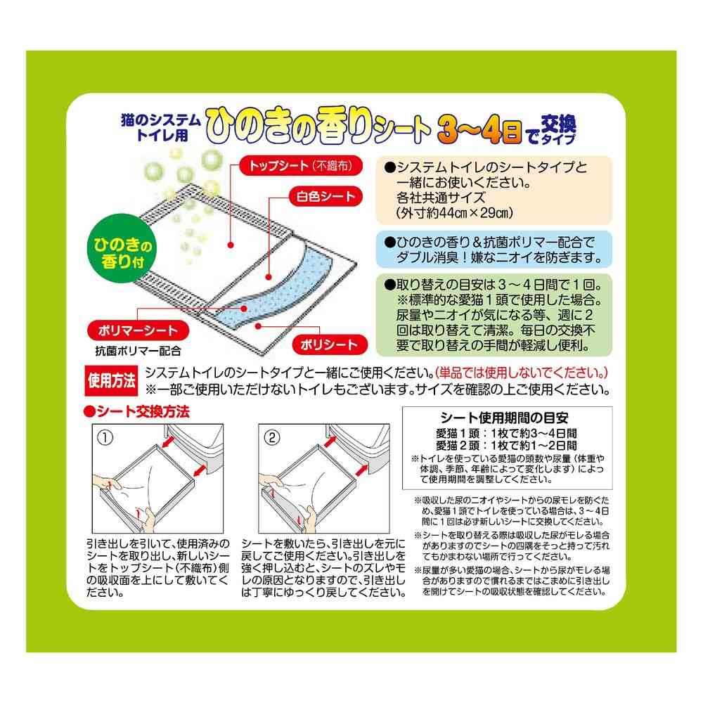 ひのきの香り&抗菌ポリマー配合でダブル消臭!嫌なニオイを防ぎます。 尿量やニオイが気になる等、週に2回は取り替えて清潔。 毎日の交換不要で取替えの手間が軽減し、便利。