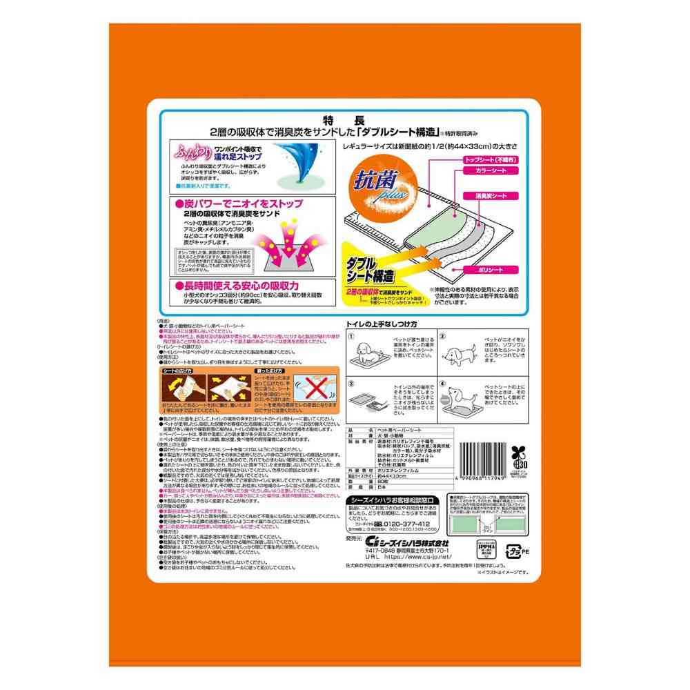 ふんわりワンポイント吸収で濡れ足ストップ。 ふんわり吸収面とダブルシート構造によりオシッコをすばやく吸収し、広がらず、逆戻りを防ぎます。 ■抗菌剤入りで清潔です。 炭パワーでニオイをストップ。 2種の吸収体で消炭をサンド。ペットの糞尿臭などのニオイの粒子を消臭炭がキャッチします。 オシッコ3回分を安心吸収。(小型犬の場合)