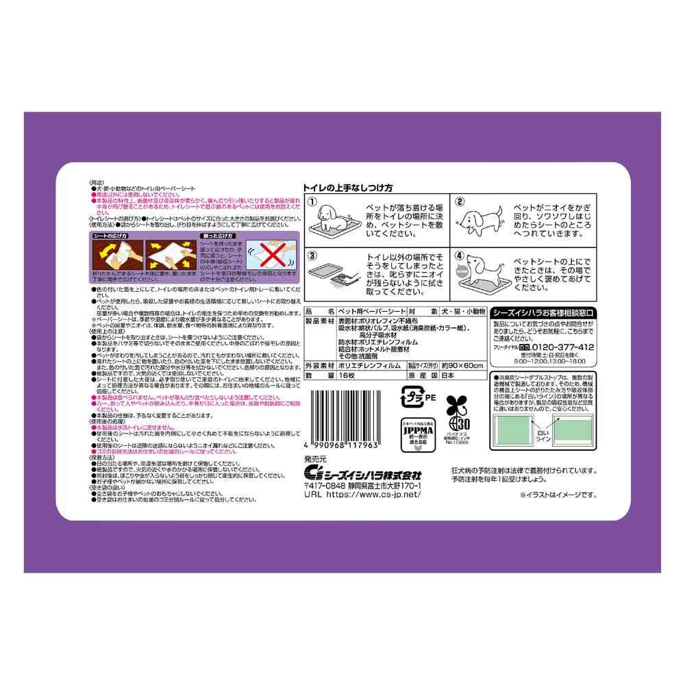 袋からシートを取り出すときは、シートを傷つけないようにご注意ください。 本製品をハサミ等で切らないでそのままご使用ください。中身のこぼれや尿モレの原因となります。 ペットがまわりを汚してしまうことがあるので、汚れてもかまわない場所に敷いてください。 濡れたシートの上に物を置いたり、色の付いた面を下にしたまま放置しないでください。 また色の付いた面で汚れた部分や水分等を拭かないでください。色移りの原因となります。 紙製品ですので、火気の近くでは使用しないでください。 シートに付着した大便は、必ず取り除いてご家庭のトイレに始末してください。地域によって処理方法が異なる場合があります。その際には、お住まいの地域のルールに従って処理してください。 本製品は食べられません。ペットが噛んだり食べたりしないよう注意してください。万一、誤って人やペットが飲み込んだり、中身が目に入った場合は、医師や獣医師にご相談ください。 本製品の仕様は、予告なく変更することがあります。
