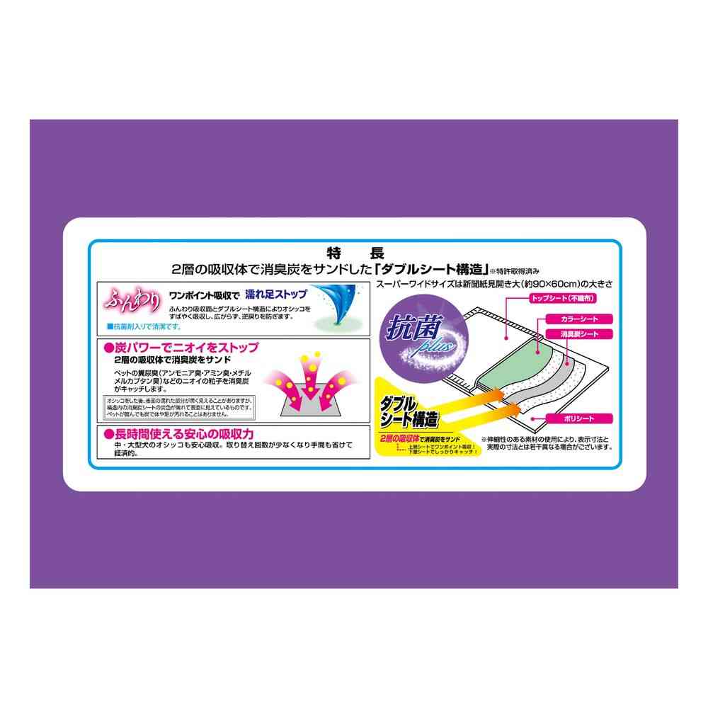 ふんわりワンポイント吸収で濡れ足ストップ。 ふんわり吸収面とダブルシート構造によりオシッコをすばやく吸収し、広がらず、逆戻りを防ぎます。 ■抗菌剤入りで清潔です。 炭パワーでニオイをストップ。 2種の吸収体で消炭をサンド。ペットの糞尿臭などのニオイの粒子を消臭炭がキャッチします。 中・大型犬のおオシッコも安心吸収。