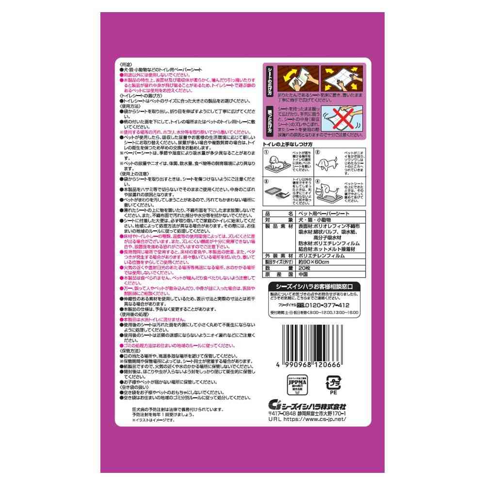 袋からシートを取り出すときは、シートを傷つけないようにご注意ください。 本製品をハサミ等で切らないでそのままご使用ください。中身のこぼれや尿漏れの原因となります。 ペットがまわりを汚してしまうことがあるので、汚れてもかまわない場所に敷いてください。 濡れたシートの上に物を置いたり、不織布面を下にしたまま放置しないでください。また、不織布面で汚れた部分や水分等を拭かないでください。 シートに付着した大便は、必ず取り除いてご家庭のトイレに始末してください。地域によって処理方法が異なる場合があります。その際には、お住まいの地域のルールに従って処理してください。 床材やトイレトレーの種類、温度等の使用環境によっては、ズレにくさに差が出る場合がございます。また、ズレにくい機能が十分に発揮できない場合や、設置面を痛める恐れがございますのでご注意ください。 長時間同じ場所で使用すると、床材の変色や本製品の密着、また、ベタつきが発生する場合があります。時々敷いている場所を拭いたり、敷いている位置をずらしてご使用ください。 火気の近くや直射日光のあたる場所等高温になる場所、水のかかる場所では使用しないでください。 本製品は食べられません。ペットが噛んだり食べたりしないよう注意してください。万一、誤って人やペットが飲み込んだり、中身が目に入った場合は、医師や獣医師にご相談ください。 伸縮性のある素材を使用しているため、表示寸法と実際の寸法とは若干異なる場合があります。 本製品の仕様は、予告なく変更することがあります。