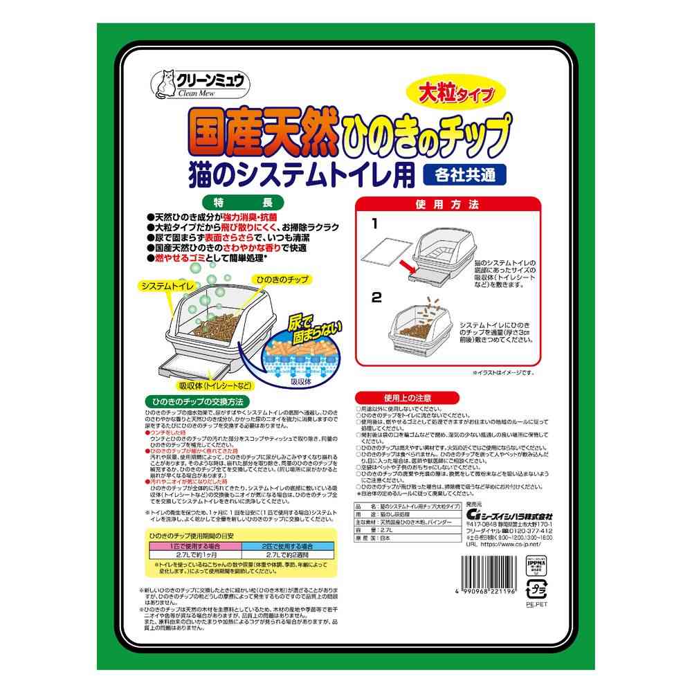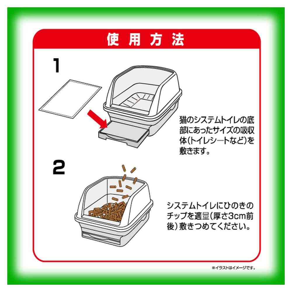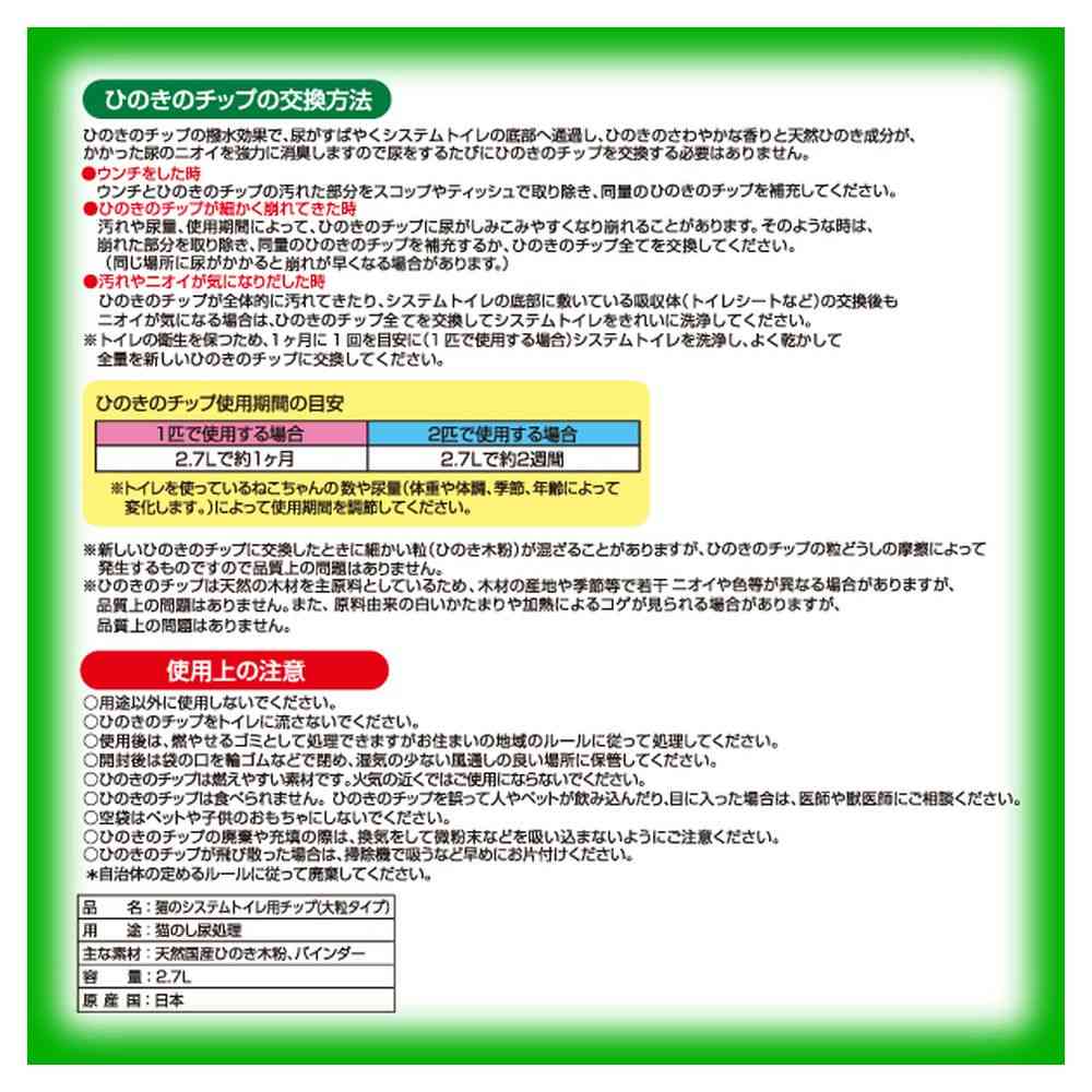 用途以外に使用しないでください。 ひのきのチップをトイレに流さないでください。 使用後は、燃やせるゴミとして処理できますがお住まいの地域のルールに従って処理してください。 開封後は袋の口を輪ゴムなどで閉め、湿気の少ない風通しの良い場所に保管してください。 ひのきのチップは燃えやすい素材です。火気の近くではご使用にならないでください。 ひのきのチップは食べられません。ひのきのチップを誤って人やペットが飲み込んだり、目に入った場合は、医師や獣医師にご相談ください。 空袋はペットや子供のおもちゃにしないでください。 ひのきのチップの廃棄や充填の際は、換気をして微粉末などを吸いこまないようにご注意ください。 ひのきのチップが飛び散らかった場合は、掃除機で吸うなど早めにお片付けください。※自治体の定めるルールに従って廃棄してください。