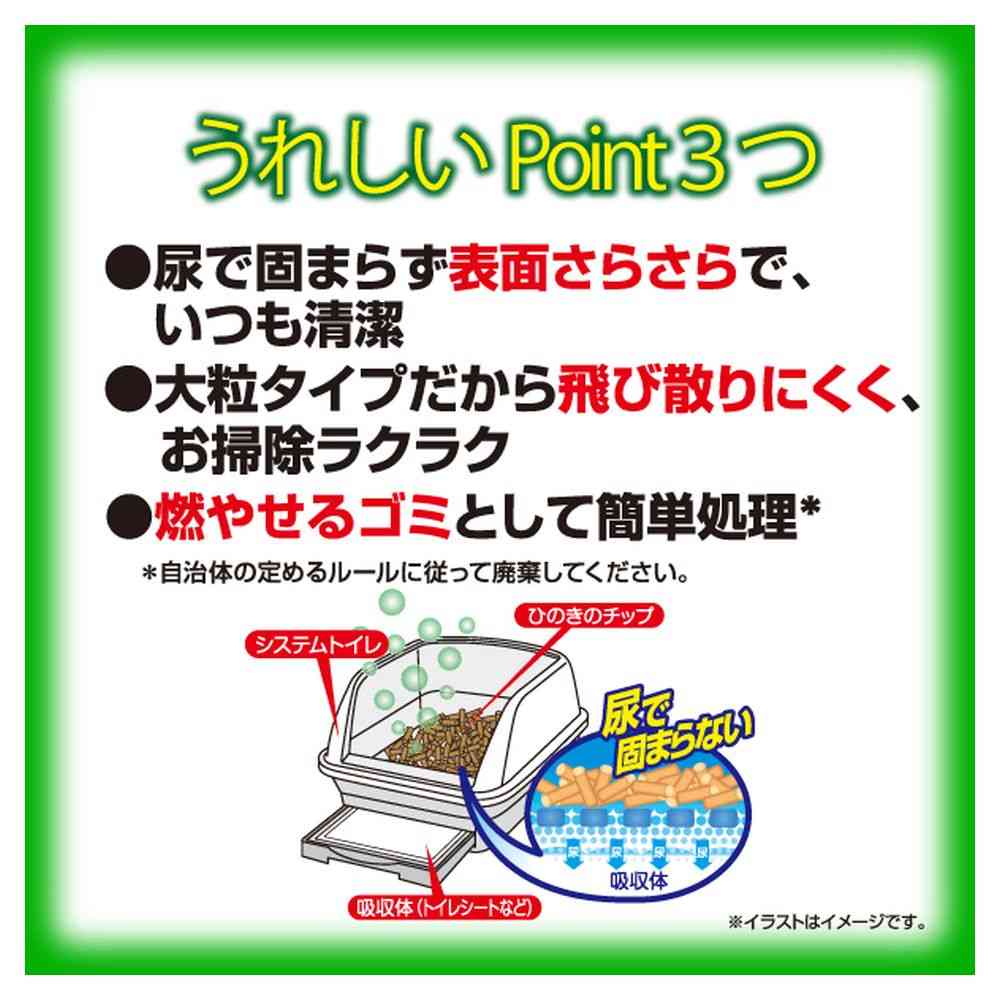 天然ひのき成分が強力消臭・抗菌、尿で固まらず表面さらさらでいつも清潔。 国産天然ひのきの爽やかな香りで快適。 燃やせるゴミとして簡単処理。 大きめの粒で飛び散りにくく、お掃除ラクラク。