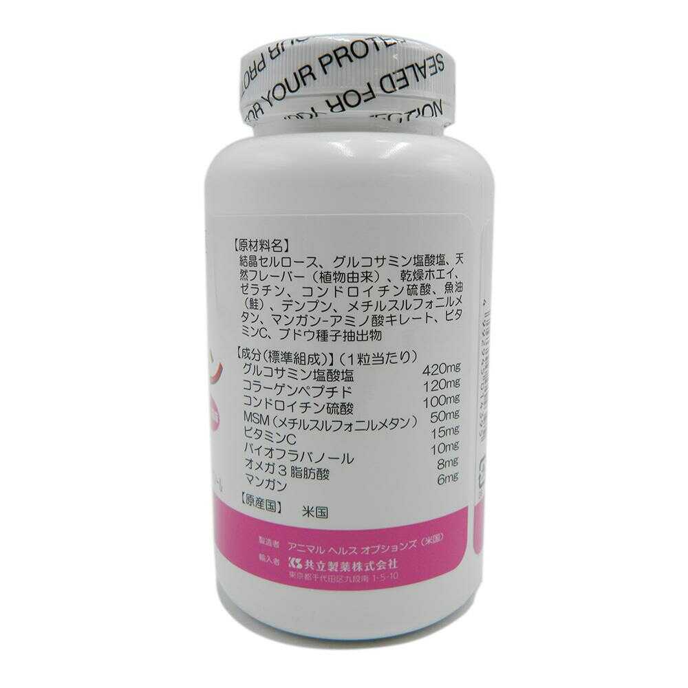 結晶セルロース、グルコサミン塩酸塩、天然フレーバー(植物由来)、乾燥ホエイ、ゼラチン、コンドロイチン硫酸、魚油(鮭)、デンプン、メチルスルフォニルメタン、マンガン-アミノ酸キレート、ビタミンC、ブドウ種子抽出物