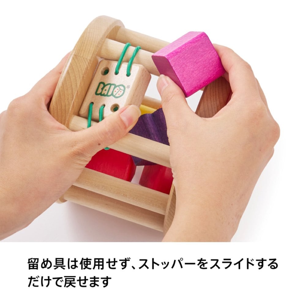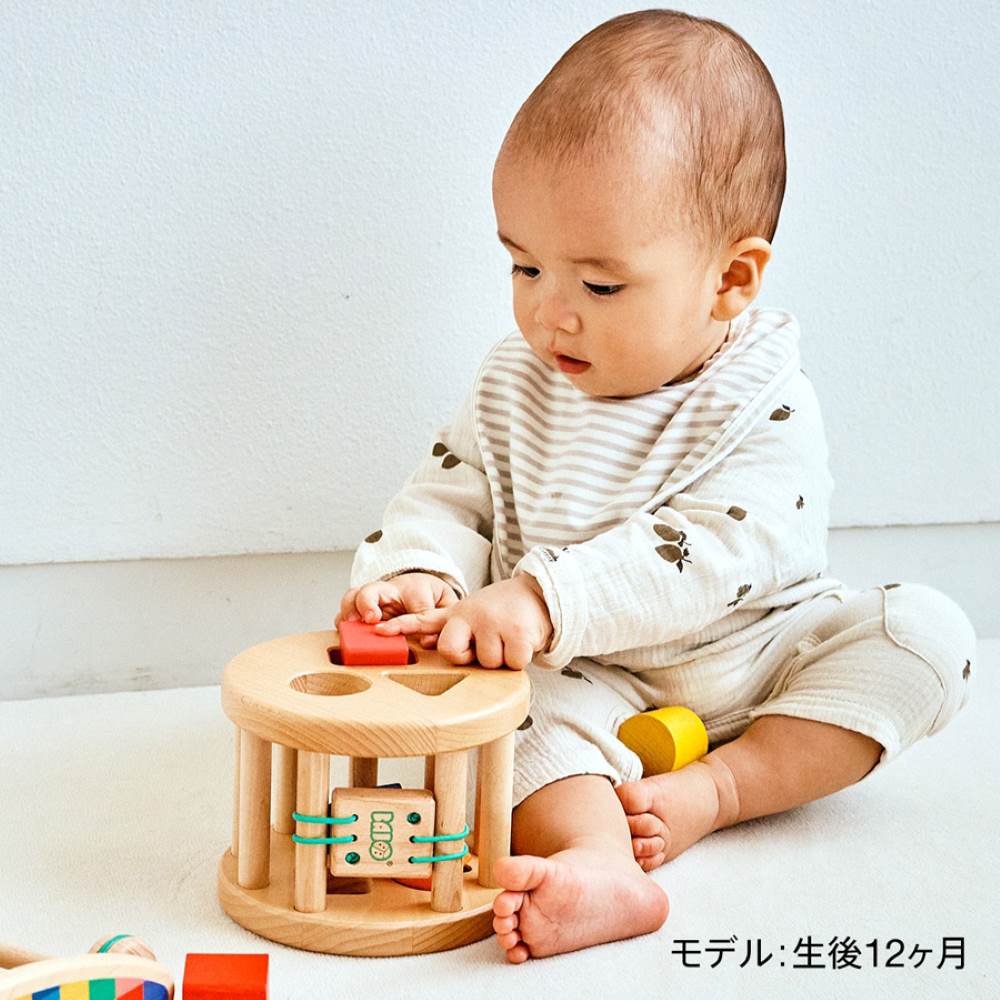 かたち合わせ」と「プルトーイ」が一つになった1歳ごろの歩きはじめから遊べるカタツムリがモチーフのあそび道具です。 “カタッコトッ”と木と木が触れ合う音、ブロックが動く様子など、美しいモザイク模様が入った台車にのせて、見て・聞いて・動かして。手遊びから形・色の学びへと、0歳から2歳くらいの成長段階にあわせていろいろなあそびが広がります。 ひもを引っ張るとクルクル回るボックスは取外し可能、ハイハイがはじまる頃には子どもと向かい合って、ボールのようにコロコロと木と木が触れ合う音をたよりに追いかけても楽しいですね。かたち遊びは、片面は三角や四角や丸と基本の形、もう片面はすこし複雑な形とステップアップして遊べます。 歩けるようになる1歳頃からは、ひもを引っ張って一緒にお散歩。ひもはヨーロッパの安全基準に準じ、お子さまの足や首に絡まらない長さになっていま本体サイズ(cm)18×15×19 重量(g)1.1kg セット内容ブロックの色/ 黄色・赤紫色・紫色・オレンジ色・赤色・ピンク色(計6色)