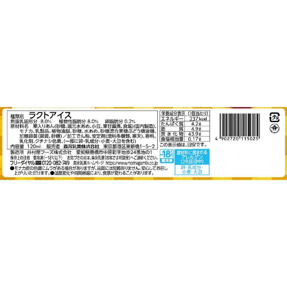 森永栗入りあずきモナカ、栗入りあずきモナカ、和風モナカ、北海道産あずき、栗粒あん、国産米粉モナカ、バニラあずきモナカ、和菓子風、森永乳業、粒あん、栗あずき