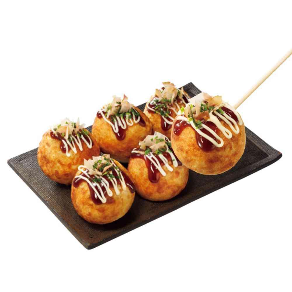 6種だしで生地のおいしさがパワーアップしました。 「焼あご」を追加し、より深いだしの旨みになりました。 外はカリっと、中はとろっとした、こだわりの生地! 特製ソース、マヨネーズ風ソース、かつお節、あおさの4種のトッピングが付いており、さらには紙皿入りで準備いらず。