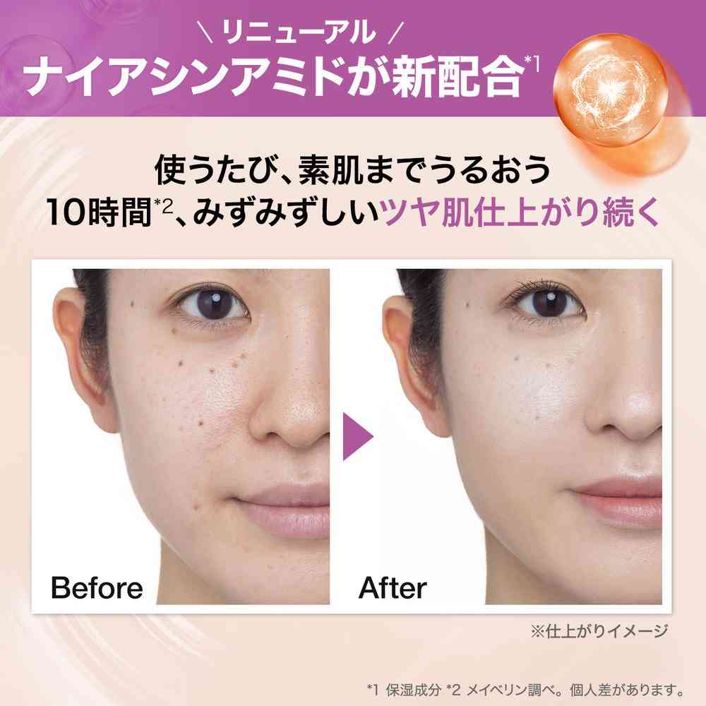 崩れにくいのに、使うたび、素肌までうるおうリキッドファンデーション。 10時間*1みずみずしいツヤ肌仕上がりが続きます。 美肌成分として知られる、ナイアシンアミドが新配合*2。 使うたび、素肌のうるおい感UP、なめらかに柔らかいすっぴん美肌へ。 *1メイベリン調べ。個人差があります。 *2保湿成分