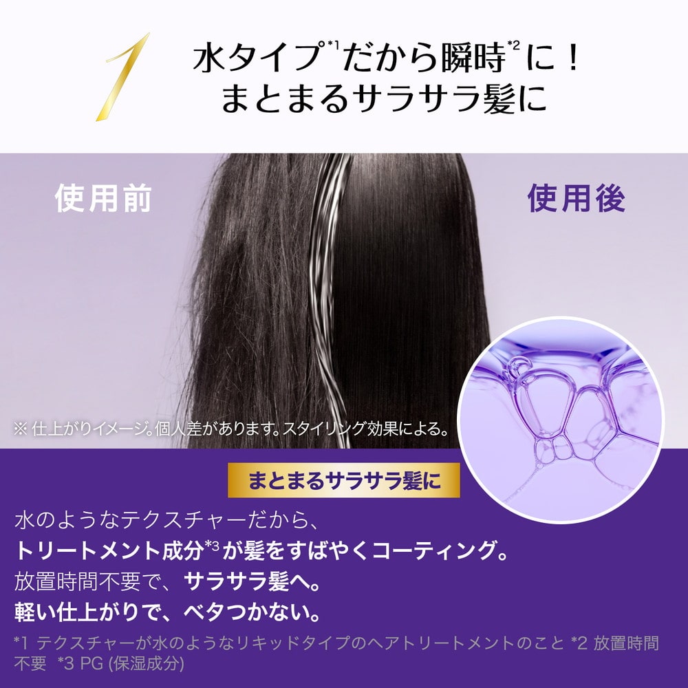 ロレアルパリ史上初!ウォータートリートメント。 水タイプの洗い流すトリートメントだから、みずみずさらりとした仕上がりに。 細かな分子が髪の表面をコーティング。 髪内部の水分を包み込み髪表面のデコボコを整え、ツヤやかで軽やかなサラサラ髪へ。