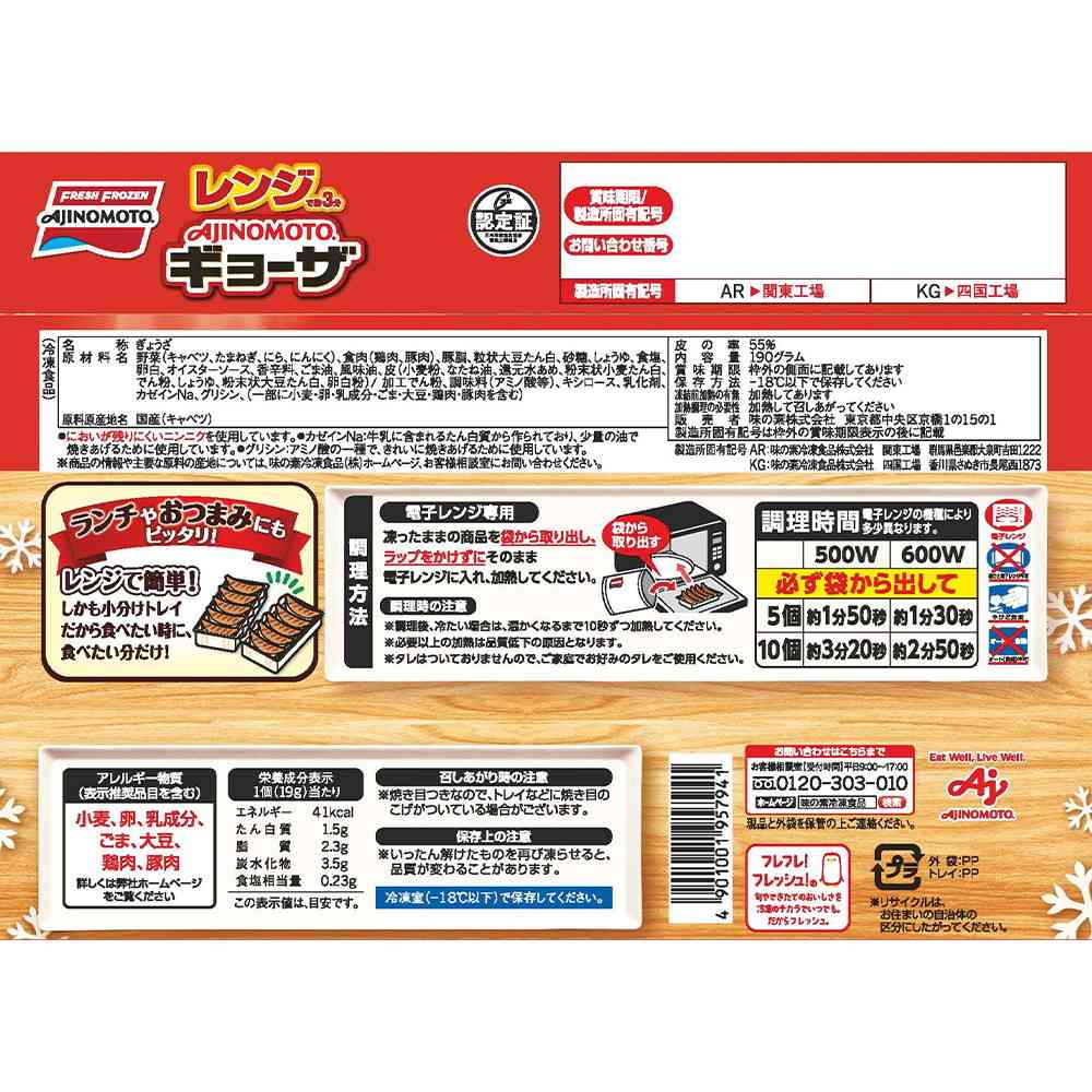 味の素冷凍食品の「ギョーザ」がレンジでも!皮がもっちり、香ばしい焼き目の餃子 【レンジ調理で忙しい時のもう1品に!】味の素冷凍食品の「ギョーザ」が、レンジでたった3分温めるだけで、香ばしくジューシーに味わえます。 フライパン要らず、忙しい時のもう1品に便利です。 【さらにおいしくジューシーに】具を増量し、さらにおいしくジューシーになりました。 【国産素材使用】お肉と野菜はすべて国産を使用しています。
