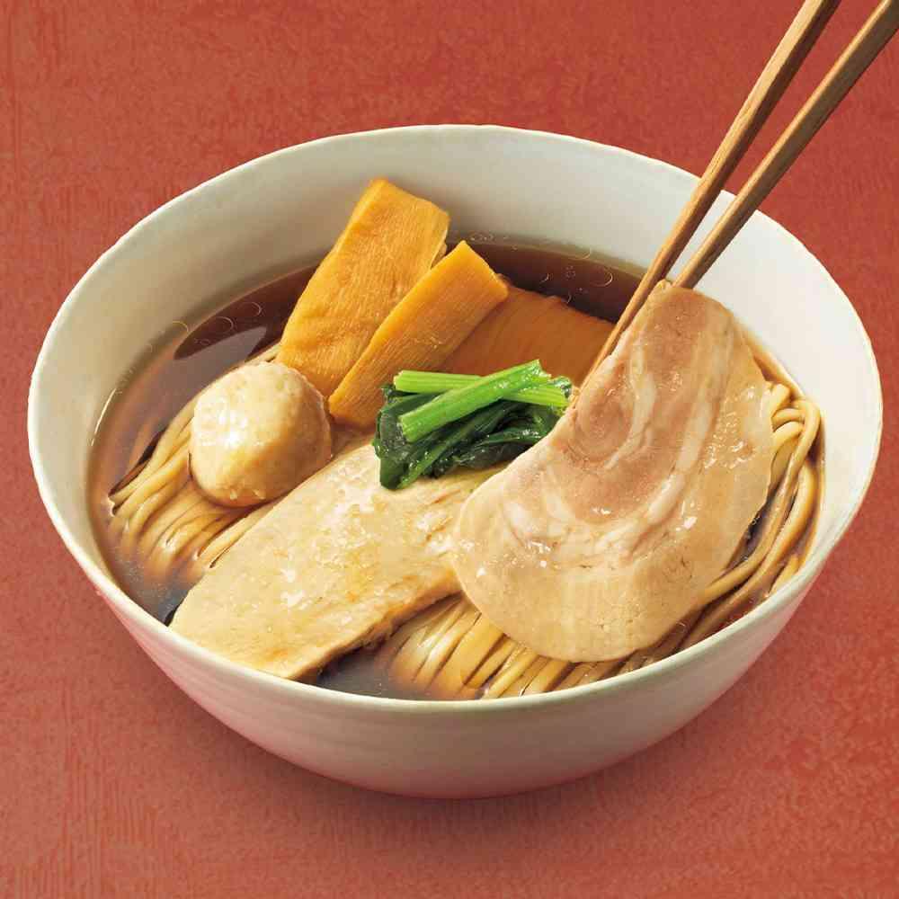 名店「らぁ麺やまぐち」監修のこだわりの5種類の具材(豚チャーシュー、鶏スライス、鶏団子、メンマ、ほうれん草)をトッピングしました。 鶏ガラの香り引き立つ味わい深い醤油ベースのスープとともにお楽しみください。