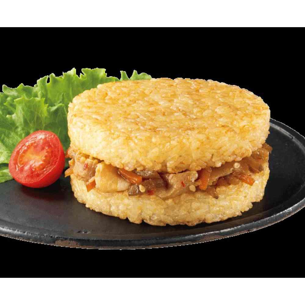 国産ごぼう国産にんじんで作ったきんぴらと豚肉をライスバンズでサンドした和風のライスバーガー。 国産ごぼうのシャキシャキ食感がアクセントになっています。 ライスバンズはお米のおいしさにこだわり国産こしひかり使用。 しょうゆみりん等で味付けたライスバンズをオーブンでこんがり焼き上げ表面はカリっと中はふっくらと仕上げました。