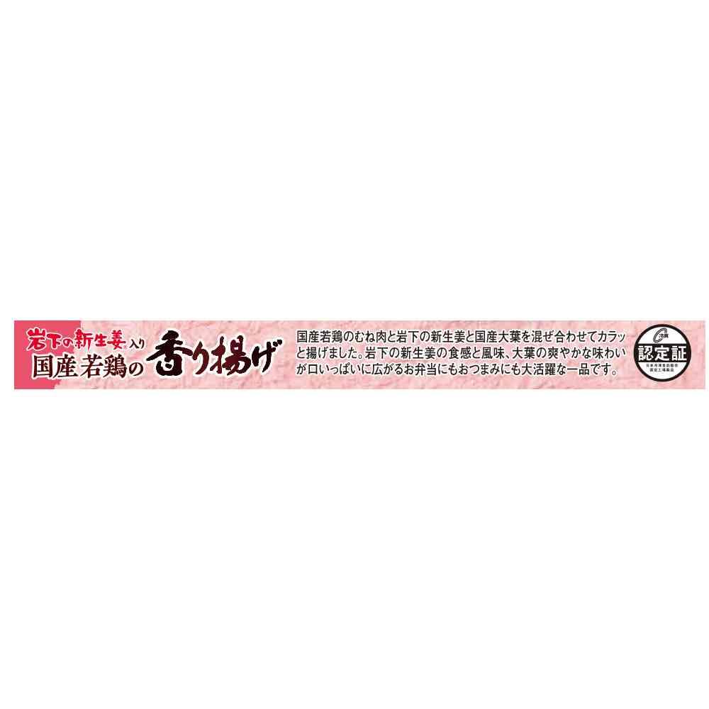 国産若鶏のむね肉と岩下の新生姜と国産大葉を混ぜ合わせてカラッと揚げました。 岩下の新生姜の食感と風味大葉の爽やかな味わいが口いっぱいに広がるお弁当にもおつまみにも最適な一品です。