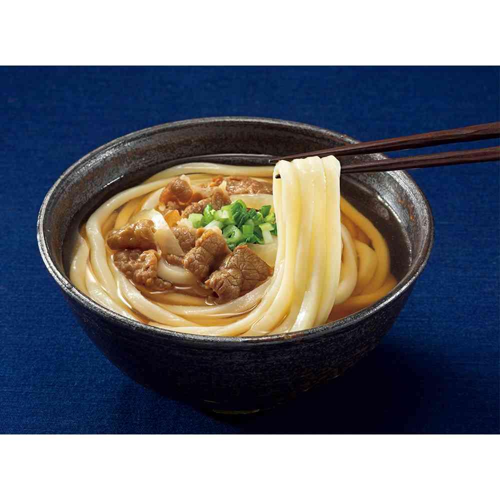 具付うどんの定番商品「讃岐麺一番肉うどん」 甘辛く味付けしたやわらかな牛肉とたまねぎ、ねぎをのせた、食べ応えのある肉うどんです。