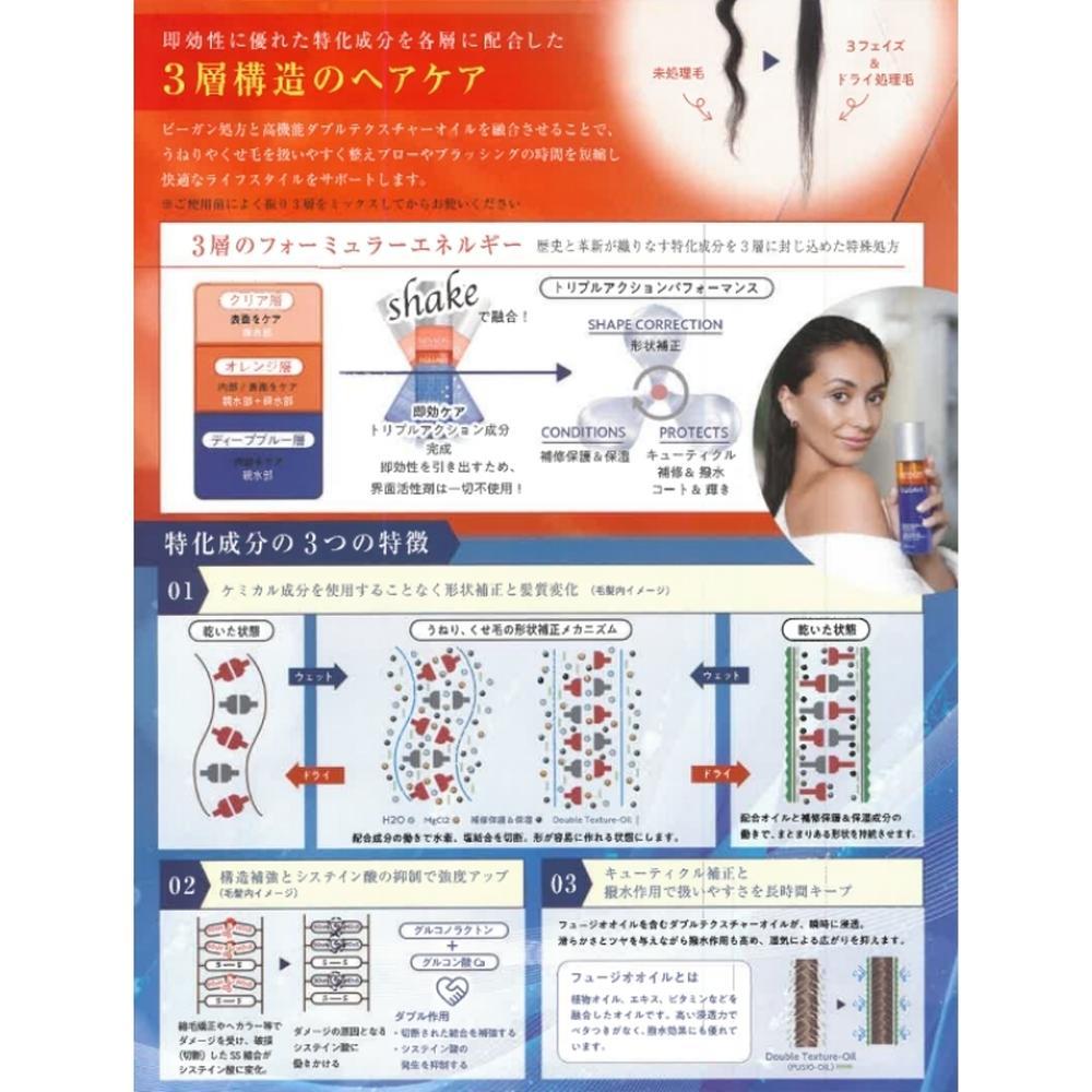 3層の融合でうねり、くせ毛の髪質を整え髪の悩みを解決します。 ケミカル成分を使用することなく形状補正と髪質変化。 構造補強とシステイン酸の抑制で強度アップ。 キューティクル補正と撥水作用で扱いやすさを長時間キープ。 即効性を引き出すため、界面活性剤は一切不使用! ビーガン処方と高機能ダブルテクスチャーオイルを融合させることで、うねりやくせ毛を扱いやすく整えブローやブラッシングの時間を短縮し快適なライフスタイルをサポートします。 ●トリプルアクションパフォーマンス ・SHAPECORRECTION形状補正 ・CONDITIONS補修保護&保湿 ・PROTECTSキューティクル補修&撥水コート&輝き ※ご使用前によく振り3層をミックスしてからお使いください。