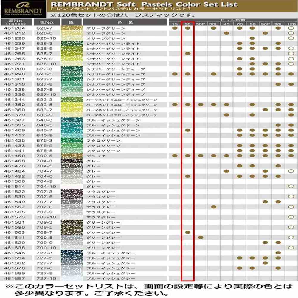 REMBRANDT レンブラント ソフトパステル 30色セット 基本色 T300C30 473377 ロイヤルターレンス社が誇る「レンブラントソフトパステル」 オランダ王室から「ROYAL」の称号を授けられた、「レンブラントソフトパステル」。プロのニーズに応えたソフトでしなやかな質感と鮮やかな発色。高い色純度と耐光性、優れた配色バランスと着色性の高品質のソフトパステルです。