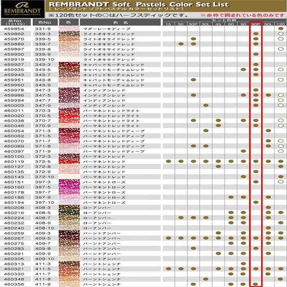 ロイヤルターレンス社が誇る「レンブラントソフトパステル」 オランダ王室から「ROYAL」の称号を授けられた、「レンブラントソフトパステル」。プロのニーズに応えたソフトでしなやかな質感と鮮やかな発色。高い色純度と耐光性、優れた配色バランスと着色性の高品質のソフトパステルです。 ※赤枠で囲われている色のみのお届けです。