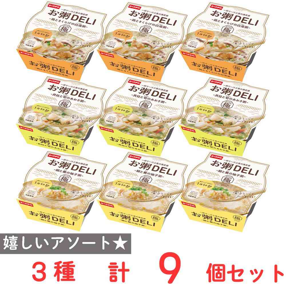 異なる魅力的な商品をお楽しみいただけます。 幸南食糧の「お粥DELI」シリーズより、 ・お粥DELI 鶏ときくらげの白湯粥 250g ・お粥DELI 貝柱と筍のあおさ粥 250g ・お粥DELI 鯛と蕪の柚子粥 240g の各種3個、計9個詰め合わせたセットです。