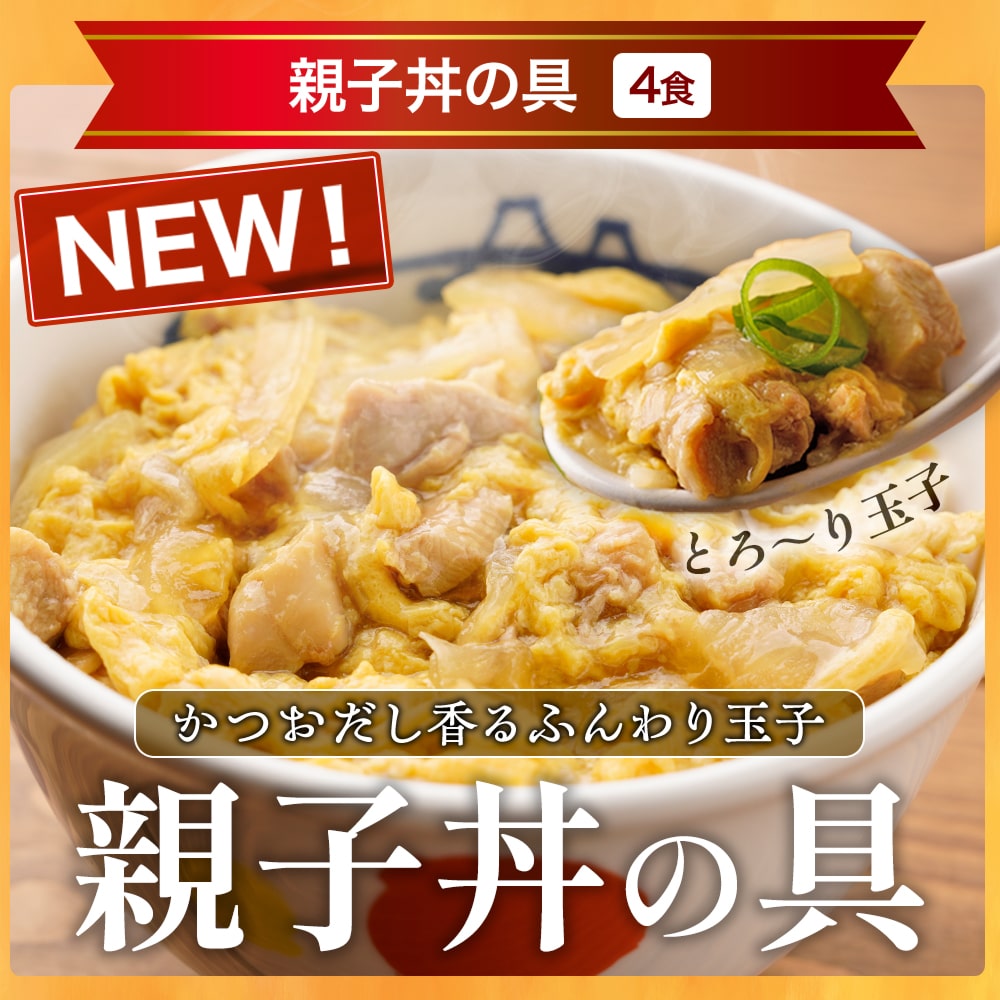 【原材料】鶏肉(ブラジル産)、玉ねぎ(中国産又は国産)、液全卵、かつおだし、しょうゆ、砂糖、清酒、本みりん,チキンブイヨン,風味調味料/増粘剤(加工でん粉, キサンタンガム),着色料(カロチノイド),調味料(アミノ酸等),(一部に卵・小麦・さば・大豆・鶏肉を含む)