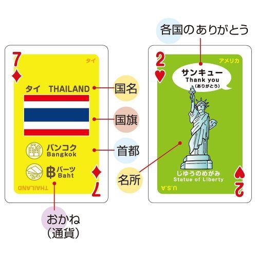 ■国名や国旗、首都や通貨などの基本的な情報に加え、あいさつや名所、民族衣装などの文化も学べます。 載っている国は13カ国!世界の13か国がトランプに!目で見て遊んで楽しんで学べる!