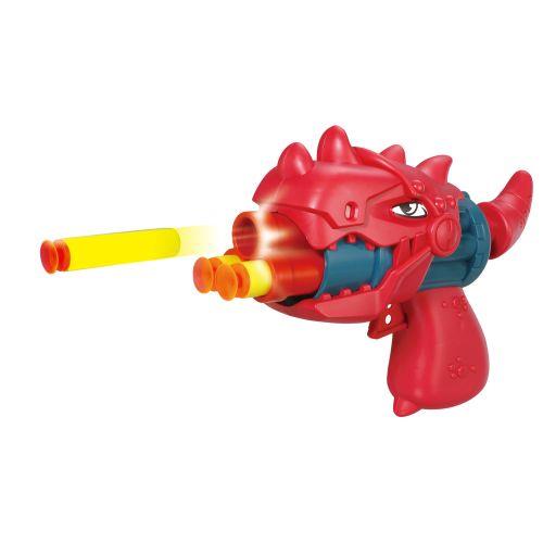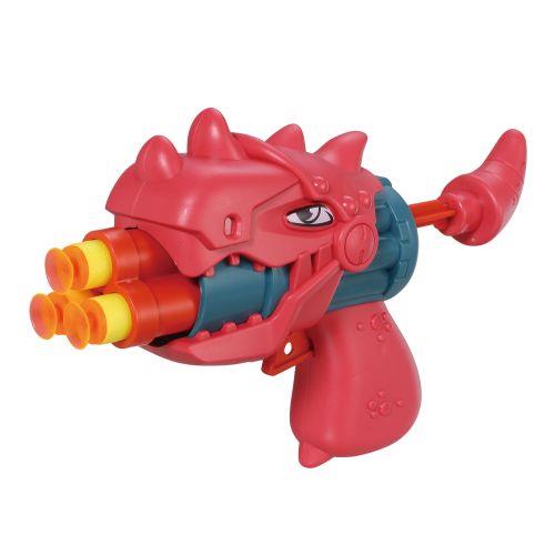 ■恐竜型の銃の玩具です。弾は怪我をしにくいスポンジ素材。人や動物に向けて射撃しないようにしてください。弾の先には吸盤がついており平面な面にくっつきます。弾は一度に3つ装填できます。