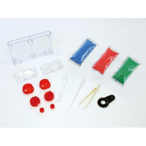 セット内容 : 本体×1、フタ×2、仕切リ板×1、アリゲッター上下×各2、接続部フタ×2、飼育砂(青赤緑)×各1、ピンセット×1、スポイト×1、ルーペ×1、解説書×1