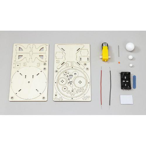 セット内容 : パーツ板A・B×各1、モーター・軸×各1、スペーサー×1、導線(赤)・(黒)×各1、電池ボックス×1、発泡スチロール球(大・中・小)×各1、両面テープ・ヤスリ×各1