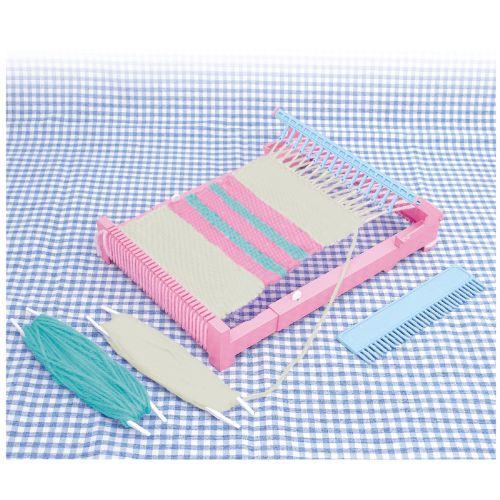 セット内容 : ハタオリキ(270~390×190×65mm)×1、毛糸3色×1セット、ピン×2、クシ(40×160mm)×1、横糸棒(25×180mm)×2