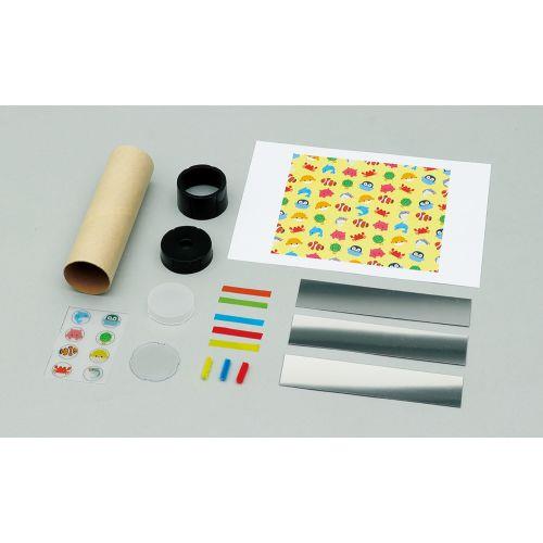 セット内容 : 紙管(Φ39×140mm)×1、キャップ(上・下)トレー(上・下)×各1、デコペーパー(A5)×1、カラーセロハン5色組×1、モール 3色組×1、プラバンシート×1、ミラー(31×140mm)×3
