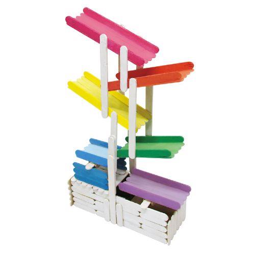 ■大小4種類のスティックをボンドでつなげて生き物や乗り物・建物を製作するキットです。アイスの棒で作る スティック工作[スティコ] コインがすべり台をすべって貯金箱に入る!