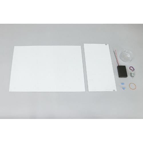 セット内容 : モーター×1、輪ゴム×1、プロペラ固定パーツ×1、トレイ×1、電池ボックス×1、台紙セット×1