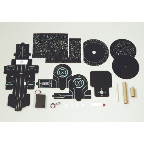 セット内容 : 本体台紙×1、土台台紙右パーツ×1、土台台紙左パーツ×1、土台長方形パーツ×1、長方形星座台紙 A×1、長方形星座台紙 B×1、目盛付円バン×1、円形星座台紙 A×1、円形星座台紙 B×1、電池ボックス×1、豆電球(ソケット付)×1、プラスチックリング×4、工作ボンド×1、丸棒×1、紙管(細)×1、紙管(太)×1