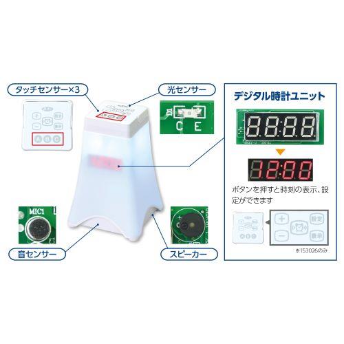 ■3つのセンサーで光と音をプログラミング※使用時はUSBポートより電源を確保して使用するか、別売の153031電池ボックス(USBケーブル付)をご使用ください。※153034ははんだ付け不要の組立キットで、LED基板にフルカ