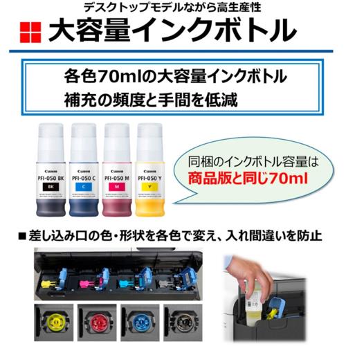 プリンター本体、電源コード、プリントヘッド、スターターインクセット(C/M/Y/BK各1個)、設置ガイド、セットアップCD-ROM、Web登録のお願い、メンテナンスカートリッジ(本体に装着済)、2インチ紙管用シャフトレスロールホルダー左右各1個