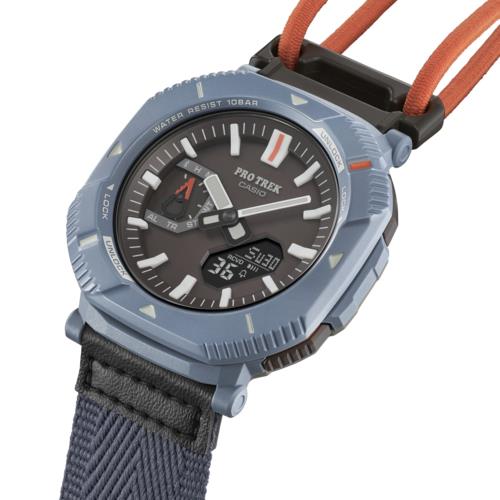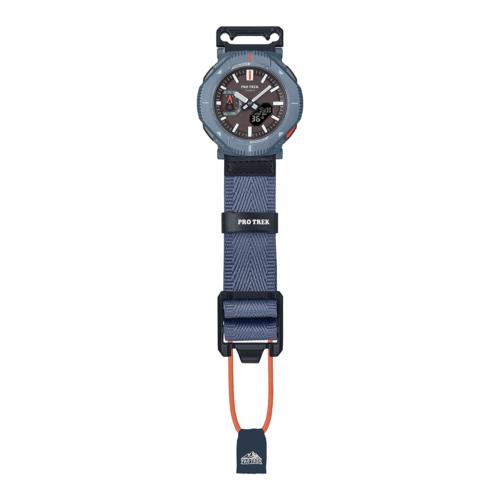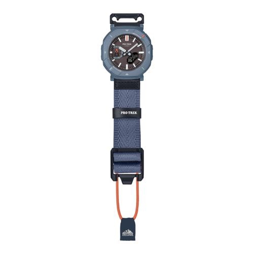 カラーリングは、自然と調和するチャコールグレー、オフホワイト、ダスティブルーのバリエーションを展開。時字やベゼルの蛍光カラーの差し色が、アウトドアファッションを彩ります。