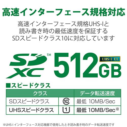 ■高速インターフェース規格であるUHS-I/UHSスピードクラスの「Class1」、および読み書き時の最低速度を保証するSDスピードクラスの「class10」に対応したSDカードです。
