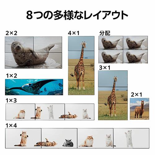 ■田の字や横4枚並びなど8つのレイアウトを選択可能です。デジタルサイネージでのマルチディスプレイ構築に活用できます。