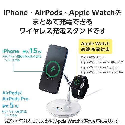 ■Qi2対応スマートフォン・Apple Watch・対応するAirPodsを同時に充電できる、3in1 Qi2規格ワイヤレス充電スタンドです。最大出力15WでiPhoneを充電できます。