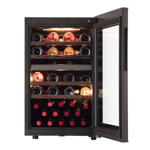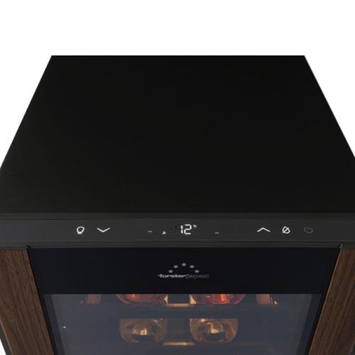 ウッドブラウンの外観とよくマッチした木製飾り付きスライド式ワイヤーラックを標準装備。ワインボトルの配置を手前と奥の二列配列とし、コンパクトなサイズに比して余裕のある収容本数を確保しています。スライド式ラックは手前半分まで引き出せるため、安全性を確保しながらも奥のワインボトルが取り出しやすい設計となっています。
